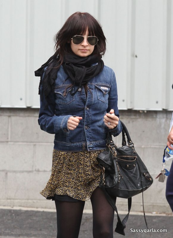 The Hollywood socialite is sporting a Hudson jean jacket, black scarf, ray ban aviator sunglasses, floral print dress, black tights and toting around a Marc Jacobs handbag.